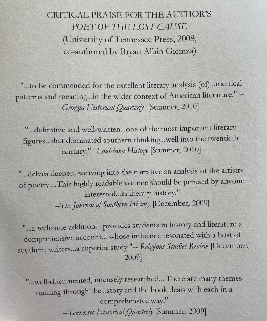 For me, this biography of a nineteenth-century Irish American Catholic priest began with the puzzle of a wild-haired poet who found himself on the wrong side of history. How in the world did he become such a large influence on regional nationalism in the wake of the American Civil War? And how did a presumptive outsider become entangled in white supremacy even as many of his compatriots espoused emancipation for both the Irish and African Americans? The answers are revealing not just of contemporaneous worldviews and competing sympathies, but of the unimaginably steep price to be paid for the volatile mingling of political and religious ideologies.